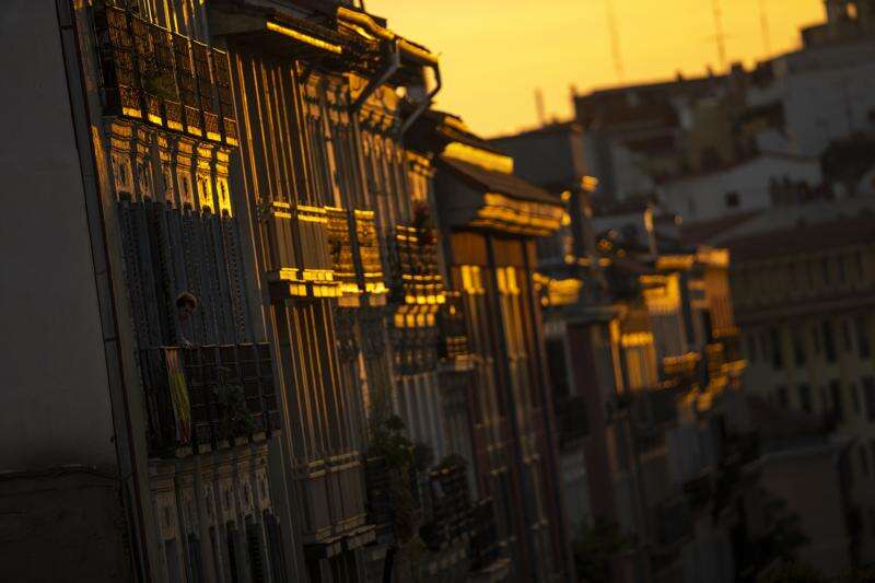 A woman looks out from a balcony as the sun sets at the end of a hot summer day in Madrid, Wednesday, Aug. 1, 2018. Much of Spain is on alert as the country's weather agency warns that temperatures could surpass 40 degrees Celsius (104 Fahrenheit) due to a hot air mass moving northward from the African continent. (AP Photo/Francisco Seco)