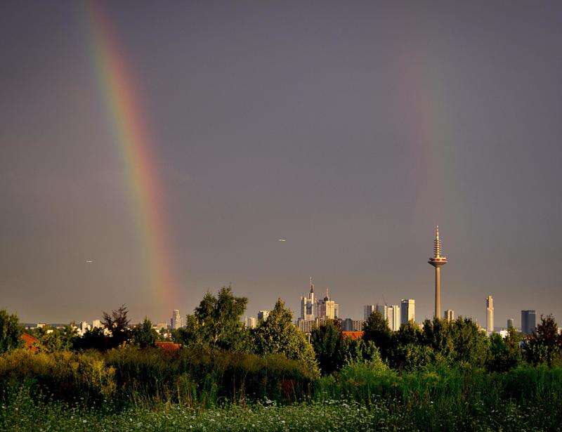 Rainbows are seen over Frankfurt, Germany, late Tuesday, July 31, 2018. (AP Photo/Michael Probst)
