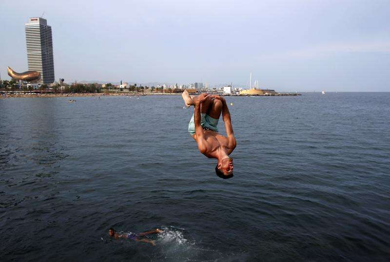 A boy somersaults into the sea at a beach in Barcelona, Spain, Wednesday, Aug. 1, 2018. Much of Spain is on alert as the country's weather agency warns that temperatures could surpass 40 degrees Celsius (104 Fahrenheit) due to a hot air mass moving northward from the African continent. (AP Photo/Manu Fernandez)