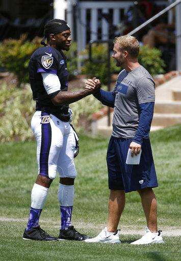 Baltimore Ravens quarterback Robert Griffin III, left, speaks with Los Angeles Rams head coach Sean McVay before a joint NFL football training camp practice at the Raven's headquarters, Monday, Aug. 6, 2018, in Owings Mills, Md. (AP Photo/Patrick Semansky) The Associated Press