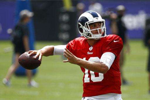 Los Angeles Rams quarterback Jared Goff throws a pass during a joint NFL football training camp practice at the Baltimore Raven's headquarters, Monday, Aug. 6, 2018, in Owings Mills, Md. (AP Photo/Patrick Semansky) The Associated Press