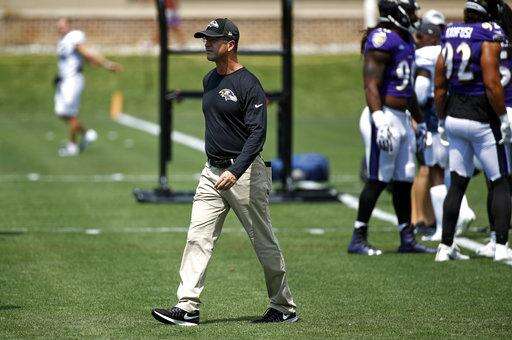 Baltimore Ravens head coach John Harbaugh walks on a field during a joint NFL football training camp practice with the Los Angeles Rams at the Raven's headquarters, Monday, Aug. 6, 2018, in Owings Mills, Md. (AP Photo/Patrick Semansky) The Associated Press