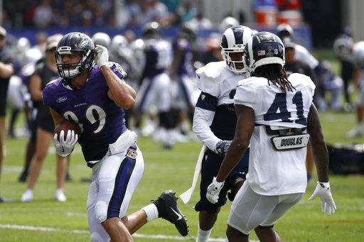 Baltimore Ravens tight end Mark Andrews, left, rushes past Los Angeles Rams defensive back Marqui Christian (41) during a joint NFL football training camp practice at the Raven's headquarters, Monday, Aug. 6, 2018, in Owings Mills, Md. (AP Photo/Patrick Semansky) The Associated Press