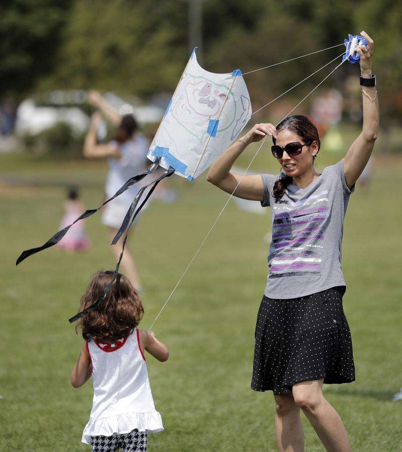 Joanne Ofiara of Elmhurst, right, helps her daughter Kara, 5, get her kite flying during the Elmhurst Kite Fest at Berens Park Saturday.