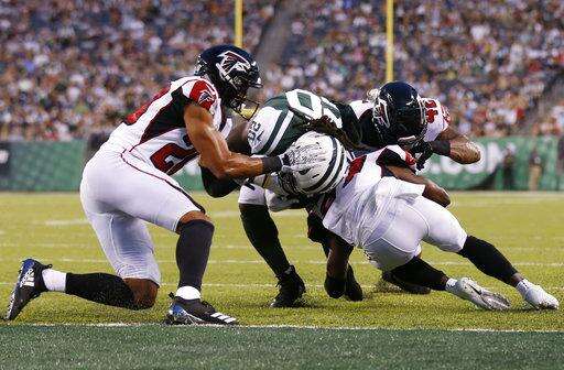 New York Jets running back Isaiah Crowell (20) breaks a tackle by Atlanta Falcons' Isaiah Oliver (20) to score a touchdown during the first half of a preseason NFL football game Friday, Aug. 10, 2018, in East Rutherford, N.J. (AP Photo/Adam Hunger) The Associated Press