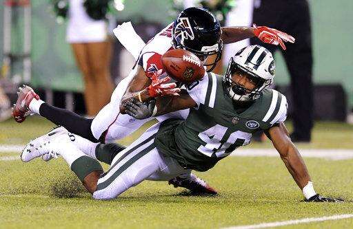 Atlanta Falcons wide receiver Reggie Davis defends against New York Jets' Trenton Cannon (40) during the second half of a preseason NFL football game Friday, Aug. 10, 2018, in East Rutherford, N.J. (AP Photo/Bill Kostroun) The Associated Press
