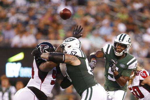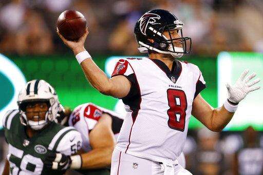 Atlanta Falcons quarterback Matt Schaub (8) throws a pass way from New York Jets' Darron Lee (58) during the first half of a preseason NFL football game Friday, Aug. 10, 2018, in East Rutherford, N.J. (AP Photo/Adam Hunger) The Associated Press
