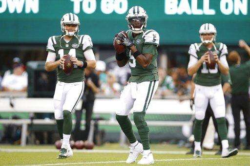 New York Jets quarterback Teddy Bridgewater (5) warms up with teammates Sam Darnold (14) and Josh McCown (15) before a preseason NFL football game against the Atlanta Falcons, Friday, Aug. 10, 2018, in East Rutherford, N.J. (AP Photo/Adam Hunger) The Associated Press