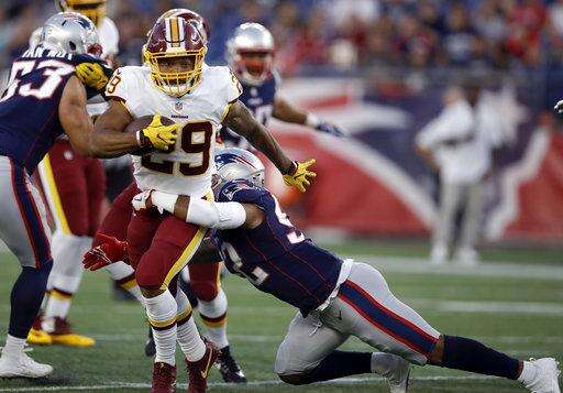 Washington Redskins running back Derrius Guice, right, evades New England Patriots linebacker Ja'Whaun Bentley (51) and defensive tackle Danny Shelton, center, during the first half of a preseason NFL football game, Thursday, Aug. 9, 2018, in Foxborough, Mass. (AP Photo/Steven Senne) The Associated Press
