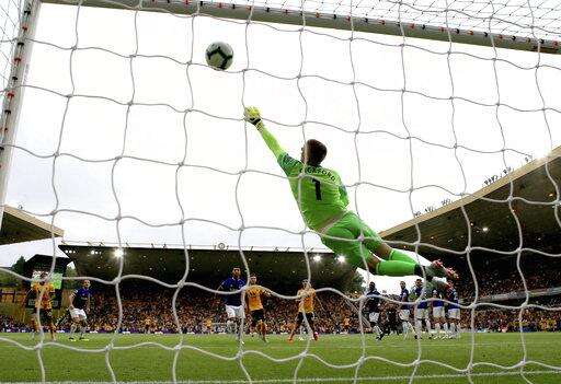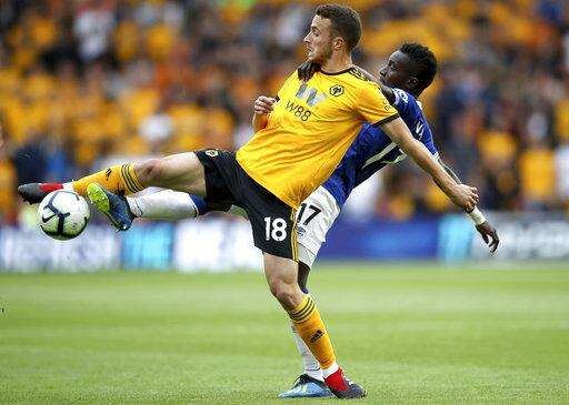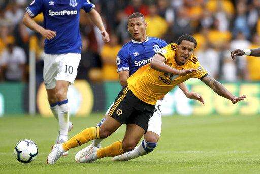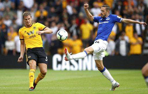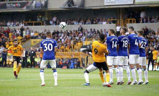 WOLVERHAMPTON, England (AP) - Ruben Neves curled in a free kick before setting up Raul Jimenez's equalizer as Wolverhampton Wanderers drew 2-2 with Everton on its return to the Premier League on Saturday.