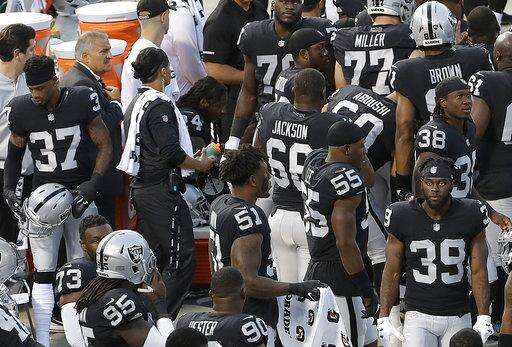 Oakland Raiders running back Marshawn Lynch, center left, sits near the sideline just before the national anthem at an NFL preseason football game between the Raiders and the Detroit Lions in Oakland, Calif., Friday, Aug. 10, 2018. Lynch remained seated for the anthem. (AP Photo/Jeff Chiu) The Associated Press