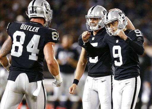 Oakland Raiders kicker Eddy Pineiro (9) celebrates with Paul Butler (84) and Johnny Townsend after kicking a field goal against the Detroit Lions during the first half of an NFL preseason football game in Oakland, Calif., Friday, Aug. 10, 2018. (AP Photo/D. Ross Cameron) The Associated Press