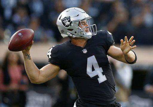 Oakland Raiders quarterback Derek Carr throws a pass against the Detroit Lions during the first half of an NFL preseason football game in Oakland, Calif., Friday, Aug. 10, 2018. (AP Photo/D. Ross Cameron) The Associated Press