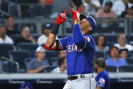 Texas Rangers' Ronald Guzman reacts as he crosses the plate after hitting a solo home run against the New York Yankees during the fourth inning of a baseball game Friday, Aug. 10, 2018, in New York. (AP Photo/Julie Jacobson) The Associated Press