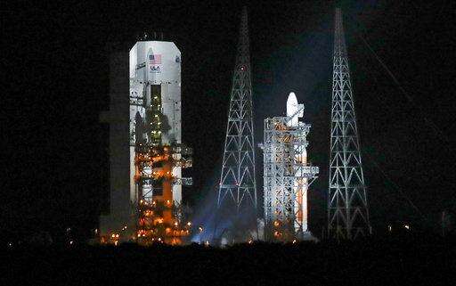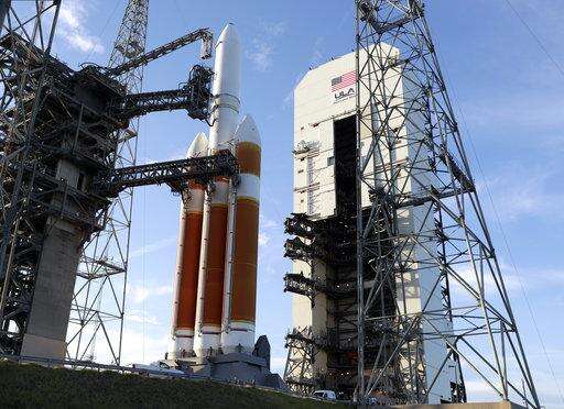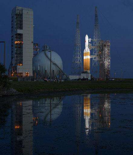 A Delta IV rocket stands ready for launch at complex 37 at the Kennedy Space Center, Friday, Aug. 10, 2018, in Cape Canaveral, Fla. The Parker Solar Probe, scheduled for lift off early Saturday morning, is protected by a first-of-its-kind heat shield and other innovative technologies that will provide unprecedented information about our Sun. (AP Photo/John Raoux)