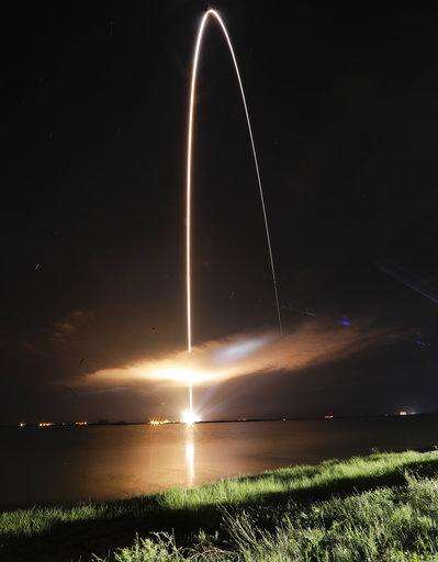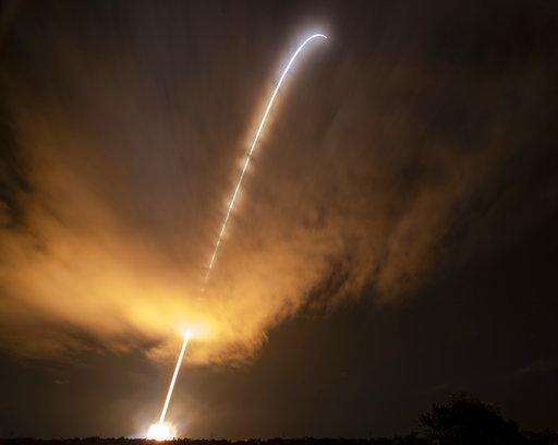A Delta IV rocket, carrying the Parker Solar Probe, lifts off from launch complex 37 as seen during a time exposure at the Kennedy Space Center, Sunday, Aug. 12, 2018, in Cape Canaveral, Fla. The Parker Solar Probe will venture closer to the Sun than any other spacecraft and is protected by a first-of-its-kind heat shield and other innovative technologies that will provide unprecedented information about the Sun. (AP Photo/John Raoux)