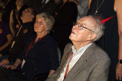 Eugene Parker, front right, a pioneer in heliophysics watches the launch of the Delta IV rocket, carrying the Parker Solar Probe, at the Kennedy Space Center, Sunday, Aug. 12, 2018, in Cape Canaveral, Fla. "All I can say is, 'Wow, here we go.' We're in for some learning over the next several years," said Parker, astrophysicist for whom the spacecraft is named. (Glenn Benson/NASA via AP)