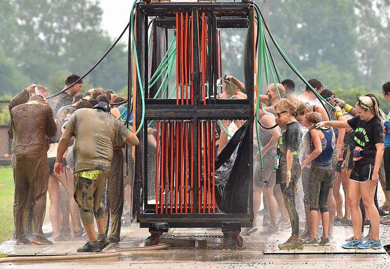 Participants hose off after finishing the Muck Fest 5K Mud Run at the Lake County Fairgrounds in Grayslake Saturday. John Starks/jstarks@dailyherald.com