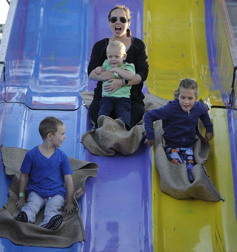 Kelly Friedrich, center, of Long Grove holds her son Connor as another son, 3-year-old Logan, left, and also Solomia Ryskin, 5, right, of Long Grove slip down the slide on the first day of Buffalo Grove Days Thursday. Mark Welsh/mwelsh@dailyherald.com