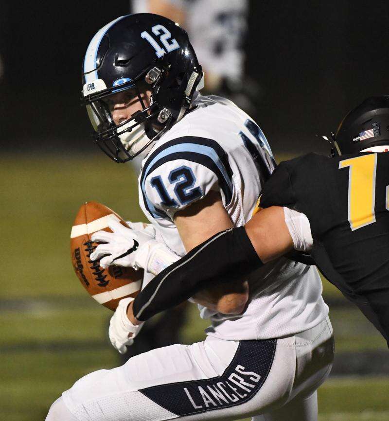 Metea Valley quarterback Patrick Straub is chased backward by Lake Park's Anthony Beacom before being tackled in the end zone for a safety in the first quarter Friday in Aurora.