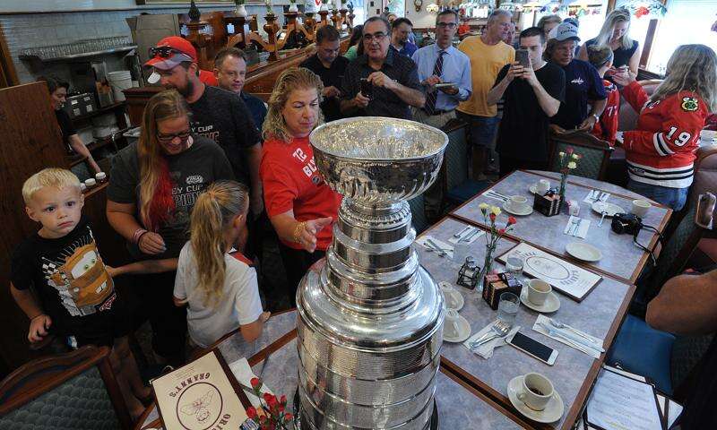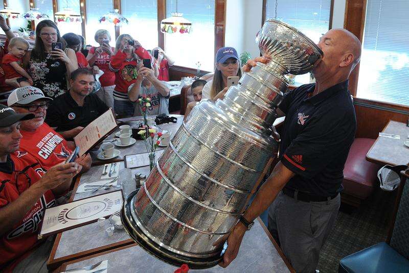 His long and fun day began about 7:30 a.m. at The Original Granny's restaurant in Wheeling. Richmond, a Lake Zurich resident, joined Granny's owner and friend George Kastanis for a picture with the Stanley Cup in the parking lot before entering the eatery.