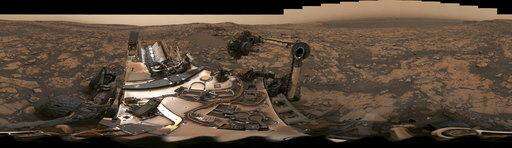 NASA released the panorama this week. A thin layer of dust is visible on Curiosity , the result of a storm that enveloped Mars this summer. The darkish sky indicates dust still clogging the atmosphere in August, when the panorama was shot by Curiosity's mast camera. The rover had just drilled for a new rock sample.