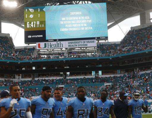 Weather has delayed another NFL game, this time in Miami between the Tennessee Titans and Dolphins.