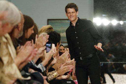 Creative Director Wes Gordon acknowledges audience applause after the Carolina Herrera spring 2019 collection was modeled during Fashion Week in New York, Monday, Sept. 10, 2018. (AP Photo/Richard Drew)
