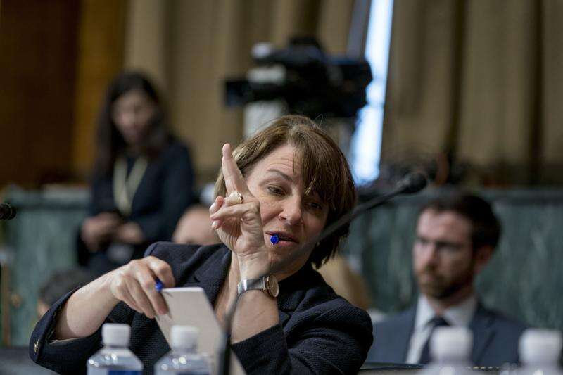 Sen. Amy Klobuchar, D-Minn., holds up her hand to speak as she shares a note with a colleague during a Senate Judiciary Committee markup meeting on Capitol Hill, Thursday, Sept. 13, 2018, in Washington. The committee will vote next week on whether to recommend President Donald Trump's Supreme Court nominee, Brett Kavanaugh for confirmation. Republicans hope to confirm him to the court by Oct. 1.(AP Photo/Andrew Harnik)