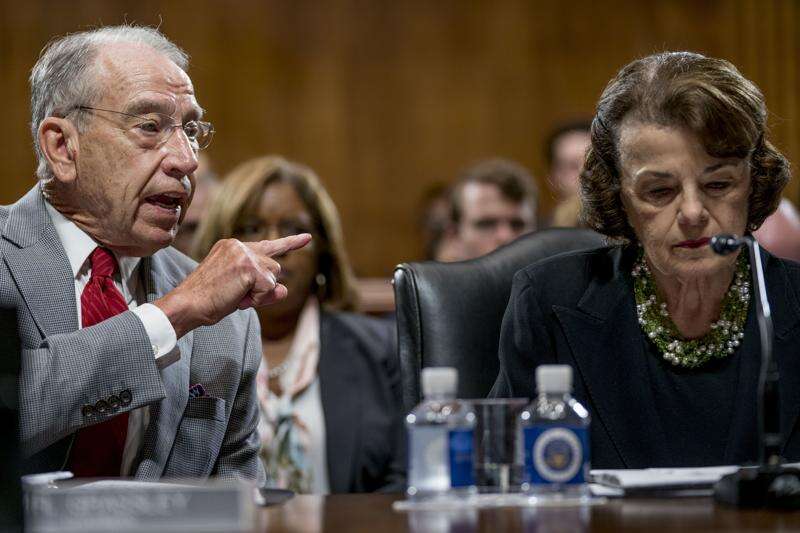 Senate Judiciary Committee Chairman Chuck Grassley, R-Iowa, left, accompanied by Sen. Dianne Feinstein, D-Calif., the ranking member, right, speaks during a Senate Judiciary Committee markup meeting on Capitol Hill, Thursday, Sept. 13, 2018, in Washington. The committee will vote next week on whether to recommend President Donald Trump's Supreme Court nominee, Brett Kavanaugh for confirmation. Republicans hope to confirm him to the court by Oct. 1.(AP Photo/Andrew Harnik)