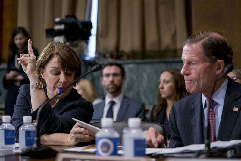 Sen. Amy Klobuchar, D-Minn., holds up her hand to speak as she shares a note with Sen. Richard Blumenthal, D-Conn., right, during a Senate Judiciary Committee markup meeting on Capitol Hill, Thursday, Sept. 13, 2018, in Washington. The committee will vote next week on whether to recommend President Donald Trump's Supreme Court nominee, Brett Kavanaugh for confirmation. Republicans hope to confirm him to the court by Oct. 1.(AP Photo/Andrew Harnik)