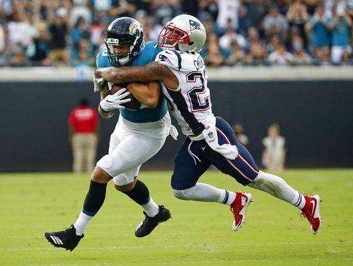 Jacksonville Jaguars tight end James O'Shaughnessy, left, is tackled by New England Patriots defensive back Patrick Chung after a reception during the first half of an NFL football game, Sunday, Sept. 16, 2018, in Jacksonville, Fla. (AP Photo/Stephen B. Morton) The Associated Press