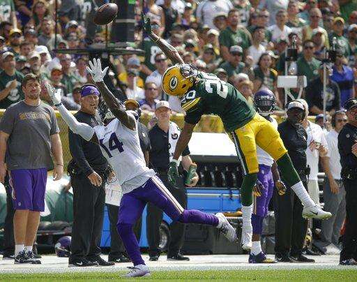Minnesota Vikings' Stefon Diggs can't catch a pass in front of Green Bay Packers' Kevin King during the first half of an NFL football game Sunday, Sept. 16, 2018, in Green Bay, Wis. (AP Photo/Mike Roemer) The Associated Press