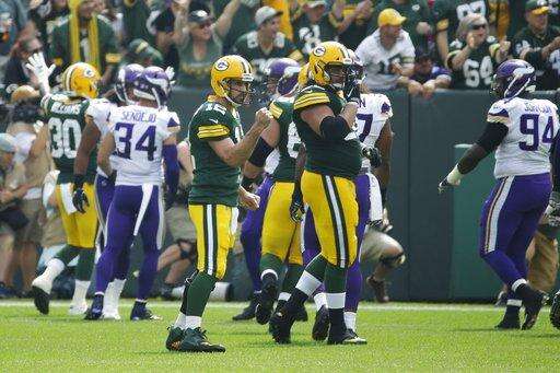 Green Bay Packers' Aaron Rodgers celebrates a touchdown pass to Davante Adams during the first half of an NFL football game against the Minnesota Vikings Sunday, Sept. 16, 2018, in Green Bay, Wis. (AP Photo/Mike Roemer) The Associated Press