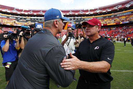 Washington Redskins head coach Jay Gruden, right, speaks with Indianapolis Colts head coach Frank Reich after an NFL football game, Sunday, Sept. 16, 2018, in Landover, Md. (AP Photo/Alex Brandon) The Associated Press