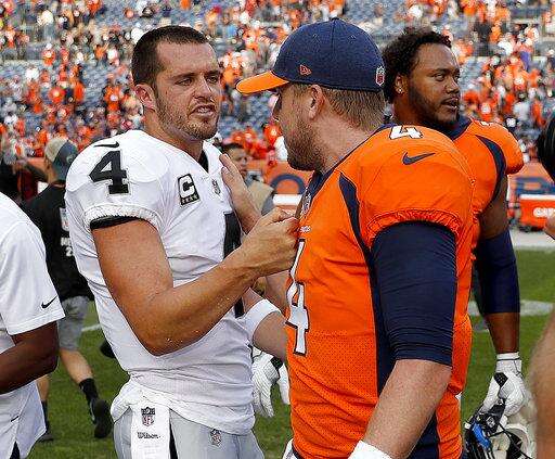 Denver Broncos quarterback Case Keenum, right, greets Oakland Raiders quarterback Derek Carr, left, after an NFL football game, Sunday, Sept. 16, 2018, in Denver. The Broncos won 20-19. (AP Photo/David Zalubowski) The Associated Press