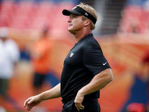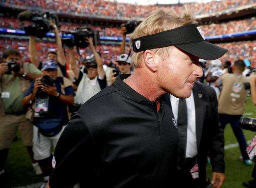 Oakland Raiders head coach Jon Gruden leaves the field after an NFL football game against the Denver Broncos, Sunday, Sept. 16, 2018, in Denver. The Broncos won 20-19. (AP Photo/David Zalubowski) The Associated Press