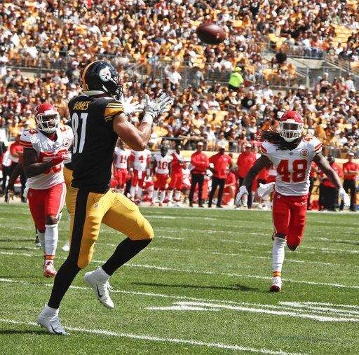 The six touchdown passes by Mahomes tied the most ever allowed by the Steelers in franchise history. Buffalo Bills Hall of Famer Jim Kelly threw six against Pittsburgh in 1991. ... Pittsburgh tight end Jesse James set a career-high with 138 yards receiving. ... Steelers wide receiver Antonio Brown caught nine passes for 67 yards, becoming the fastest player in NFL history to cross the 750-career reception total (117 games). ... Roethlisberger moved past John Elway and into seventh for career passing yards. ... The Chiefs scored six touchdowns and had just 27:49 time of possession. Their longest scoring drive lasted just 3:57. ... Mahomes' six scores tied Len Dawson's franchise mark set in 1964 against Denver when the Chiefs played in the American Football League.