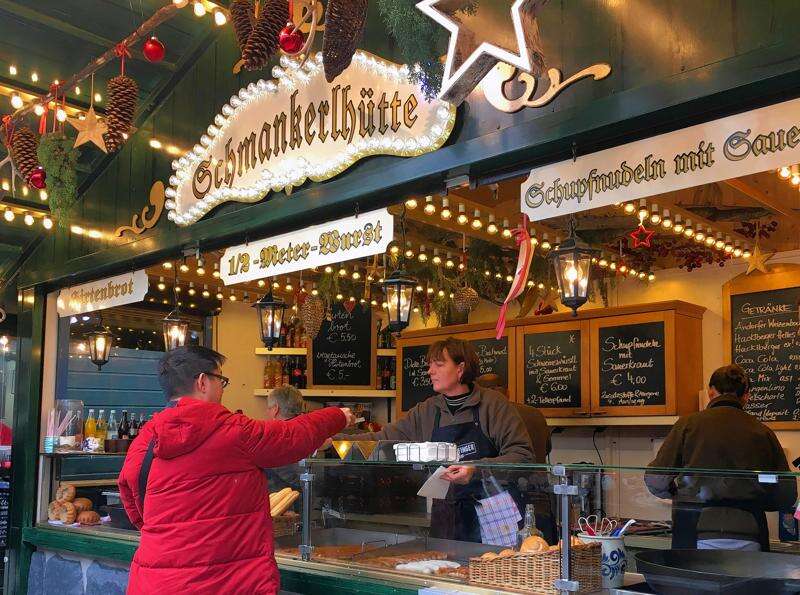 Refortified, I made my way back to the plaza outside the cathedral where bells sounding the hour reverberated around more than 70 rustic wooden Christmas market kiosks. Patrons stood around high tables scarfing down foot-long wurst sandwiches. I resisted the temptation of gluhwein stands to seek out something German-made for that someone still on my gift list. I found it inside a makeshift shop where a young woman was selling woolen hats and cute head wraps made by her German grandmother.