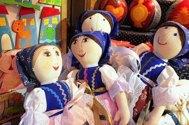 In Slovakia, sausages and potato pancakes simmered on stoves in a small market outside Bratislava Castle perched 300 feet above the Danube. Our excursion stopped for a view from the windy terrace then descended to the Old Town. We entered through St. Michel's Tower, the only remaining gate from medieval fortifications, and stared at the red-hooded bust marking the executioner's house. A walk on cobblestones past warmly lit cafes and shops led to the Opera House and a market where cloth dolls in folk dress caught my eye.