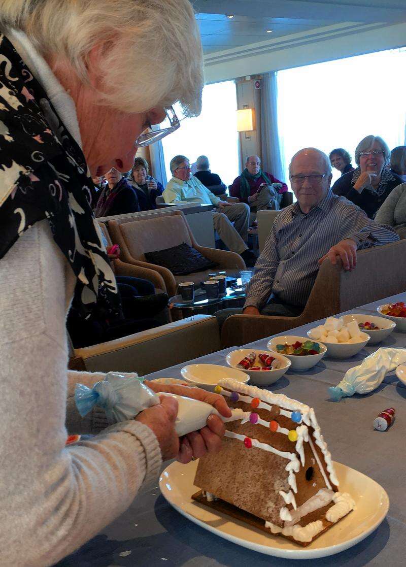 Passengers participated in trimming Christmas trees, personalizing globe ornaments with markers. The pastry chef patiently taught us the art of gingerbread house-making and to my envious eyes some structures turned out quite good.