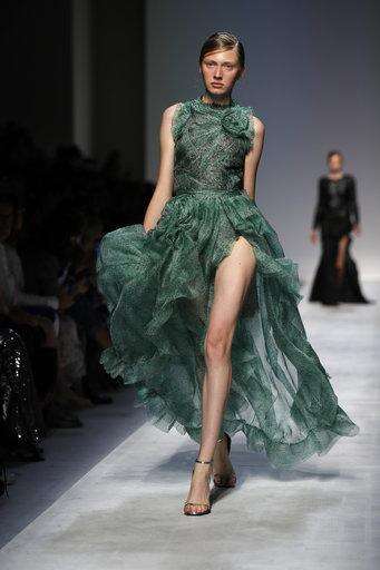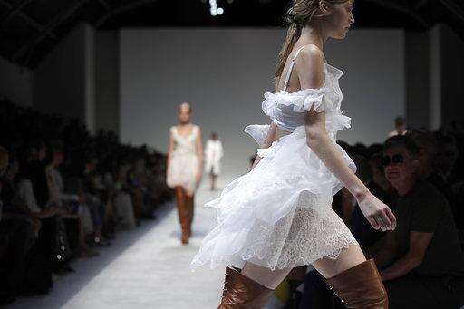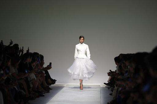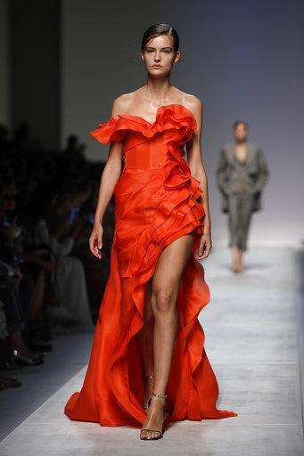 A model wears a creation as part of the Scervino women's 2019 Spring-Summer collection, unveiled during the Fashion Week in Milan, Italy, Saturday, Sept. 22, 2018. (AP Photo/Luca Bruno)