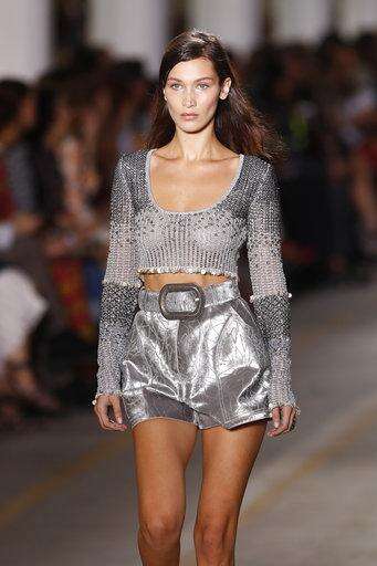 Model Bella Hadid wears a creation as part of the Cavalli women's 2019 Spring-Summer collection, unveiled during the Fashion Week in Milan, Italy, Saturday, Sept. 22, 2018. (AP Photo/Antonio Calanni)