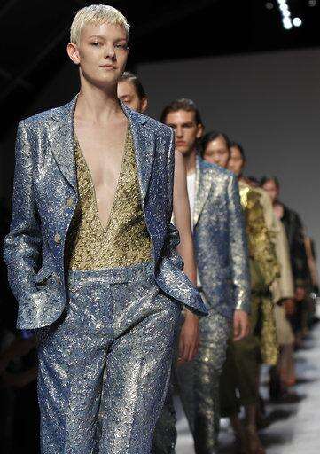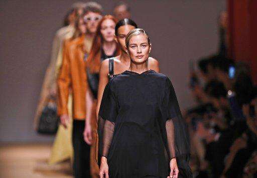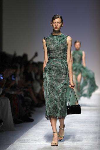 Models wear creations as part of the Salvatore Ferragamo women's 2019 Spring-Summer collection, unveiled during the Fashion Week in Milan, Italy, Saturday, Sept. 22, 2018. (AP Photo/Antonio Calanni)