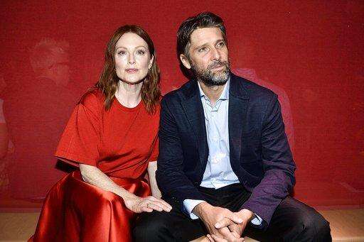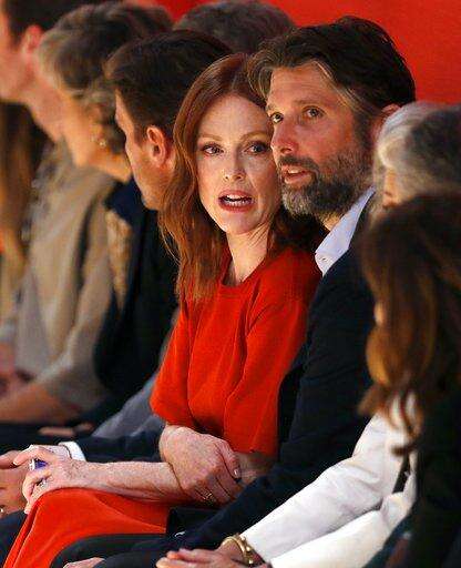 Actress Julianne Moore and Bart Freundlich attend the Salvatore Ferragamo women's 2019 Spring-Summer collection, unveiled during the Fashion Week in Milan, Italy, Saturday, Sept. 22, 2018. (AP Photo/Antonio Calanni)