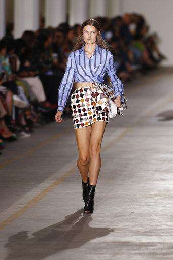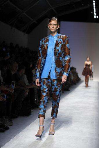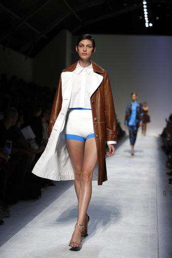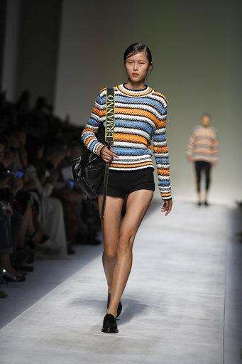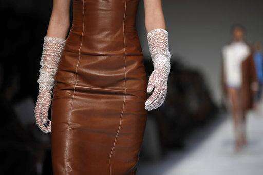A model wears a creation as part of the Salvatore Ferragamo women's 2019 Spring-Summer collection, unveiled during the Fashion Week in Milan, Italy, Saturday, Sept. 22, 2018. (AP Photo/Antonio Calanni)