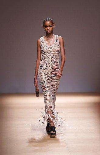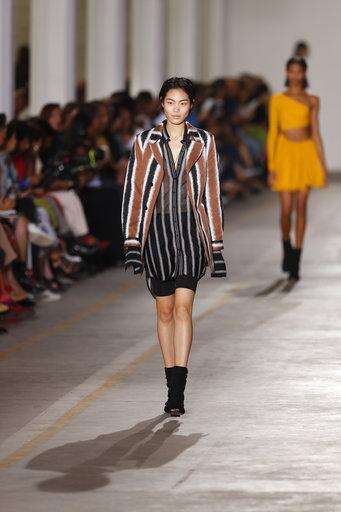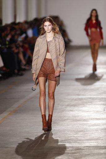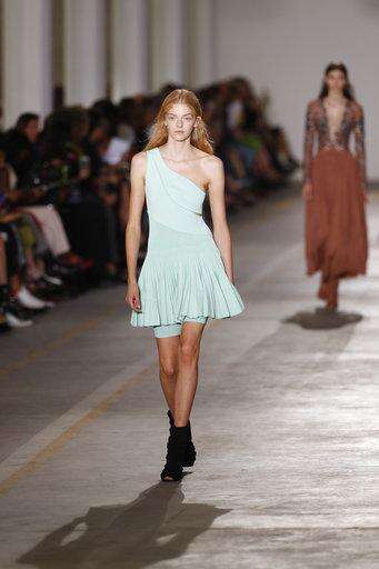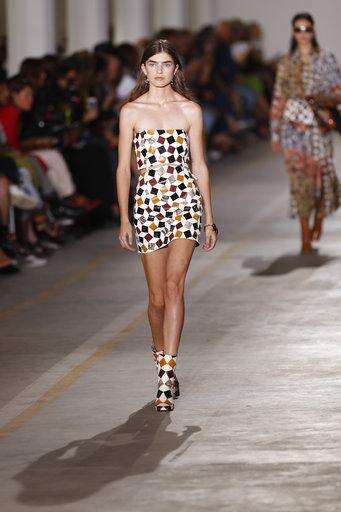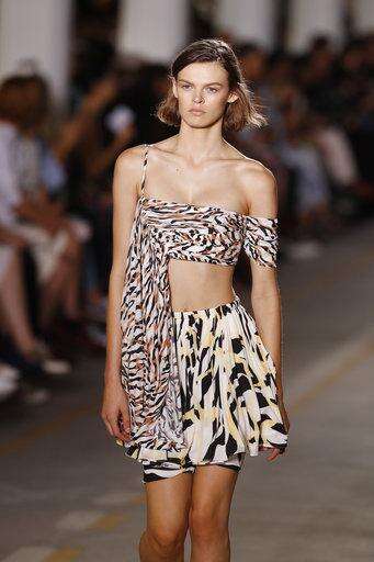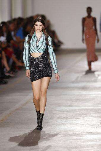 A model wears a creation as part of the Cavalli women's 2019 Spring-Summer collection, unveiled during the Fashion Week in Milan, Italy, Saturday, Sept. 22, 2018. (AP Photo/Antonio Calanni)