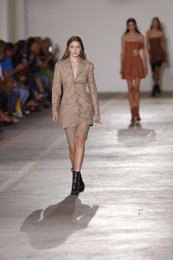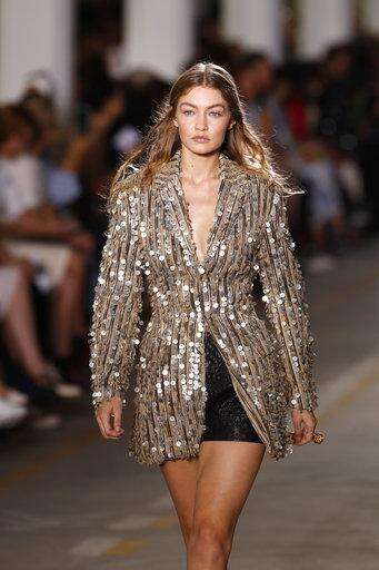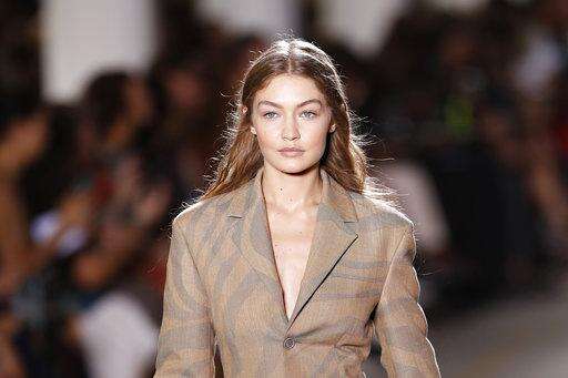 Model Gigi Hadid wears a creation as part of the Cavalli women's 2019 Spring-Summer collection, unveiled during the Fashion Week in Milan, Italy, Saturday, Sept. 22, 2018. (AP Photo/Antonio Calanni)