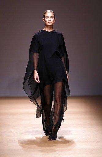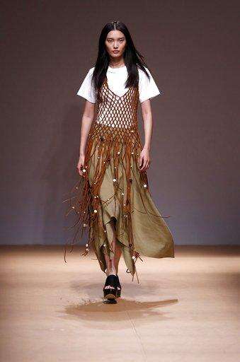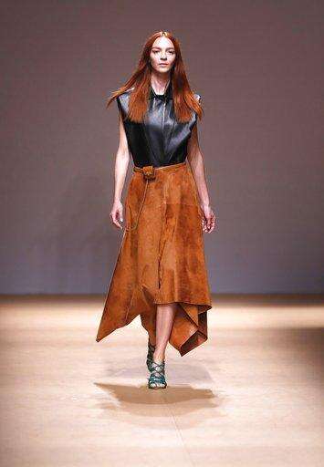 The brand is looking to target youth while still maintaining its traditional mature customers, sending out experienced models, including 1990s cover-girl Stella Tennant, to underline that point. Tennant opened the show in an olive leather handkerchief skirt, belted with a taupe T-shirt. Woven boots finished the look.