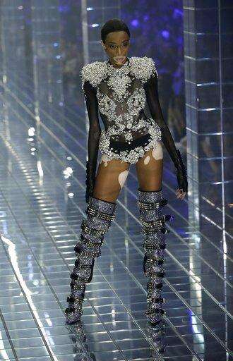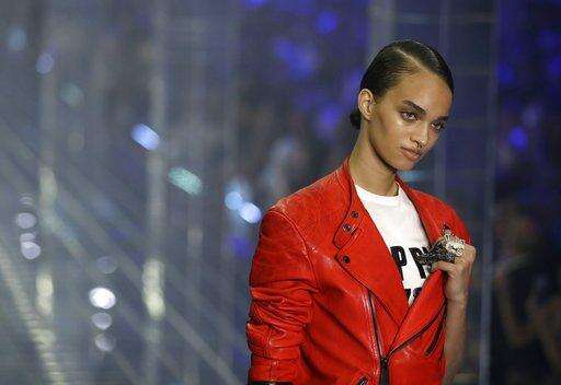 A model wears a creation part of Philipp Plein's women's 2019 Spring-Summer collection, unveiled during the Fashion Week in Milan, Italy, Friday, Sept. 21, 2018. (AP Photo/Luca Bruno)